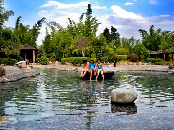 山莊共擁有泡池 33 個,其中溫泉池 24 個,冷水池 9 個,并設有 800 平方米的室內溫泉游泳池一個,按摩理療室 13 間。美容護理項目所用產(chǎn)品為臺灣佐登妮絲國際美容 SPA 館 Q10 系列特色美容產(chǎn)品,采用歐式樣經(jīng)絡按摩手法,配合呼吸、音樂韻律可有效達到身心放松的目的。福泉山莊熱泉水“氡”的含量達到 130INA ,正常情況下,氡元素含量達到 30INA 即可作為生殖系列輔助治療藥物。
