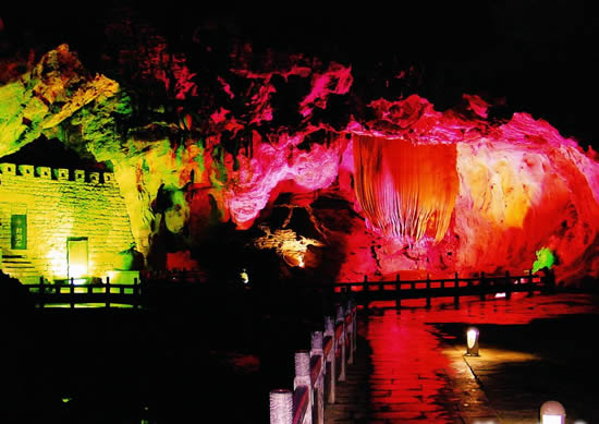 奇梁洞位于縣城北四公里處,屬典型的碳酸鹽巖洞,該洞以奇、秀、闊、幽四大特色著稱。洞長6000余米,共分五大景區(qū):即古戰(zhàn)場、畫廊、天堂、龍宮和陰陽河。洞中有山,奇梁洞圖片山中有洞,洞洞相連。它集奇巖巧石,流泉飛瀑于一洞,由千姿百態(tài)的石筍、石柱、石鐘乳構(gòu)成了一幅幅無比瑰麗的畫卷。一條小溪穿洞而過,水流平緩,燈光打在巖壁上,皺襞倒影在水中,如夢如幻。巖洞用五光十色的霓虹燈打在石筍、石幔及石花上,營造出一個(gè)流光溢彩的世界。在洞內(nèi)有一大廳,據(jù)傳是苗民糾集的地方,廳里立著一塊帶一個(gè)小孔的石頭,對著小孔“嗚嗚”地吹,整個(gè)大廳會(huì)回蕩著低沉的號(hào)角聲,當(dāng)年的苗民就是用這種方式傳令的。