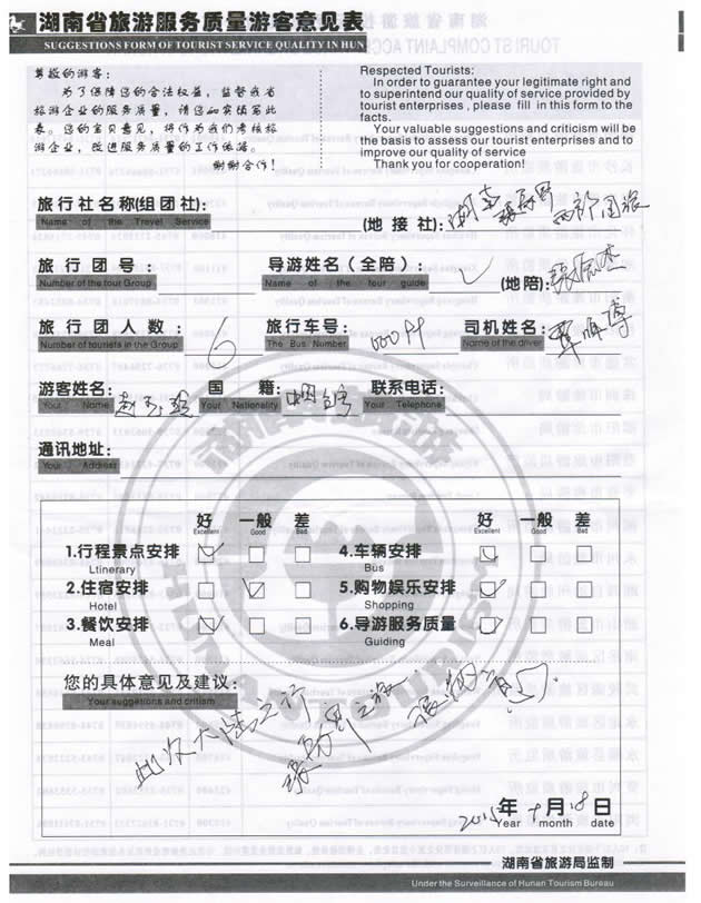 5月份,臺(tái)灣趙女士一行6位貴賓與湖南西部(張家界)中國(guó)國(guó)際旅行社工作人員——小龔取得聯(lián)系,經(jīng)過商談,雙方達(dá)成協(xié)議并簽訂旅游合同,于9月12日抵達(dá)張家界,開始張家界之旅。此次行程是由我社優(yōu)秀導(dǎo)游——張杰負(fù)責(zé)旅游接待工作,張導(dǎo)在旅游過程中講解詳細(xì),客人也很滿意,在意見表上寫道:此次大陸之行、張家界之旅、很滿意。同時(shí)也感謝趙女士一行貴賓選擇湖南西部(張家界)中國(guó)國(guó)際旅行社,以及您對(duì)湖南西部國(guó)旅的信任與支持。我們會(huì)繼續(xù)努力,做好旅游接待工作。期待下一次與您的合作,祝您愉快!