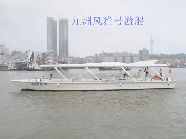 “九洲風雅”號游船:船長23.08米,寬5.03米,擁有80客位。此船造型簡約,有很強的時尚設計感,與馬爾代夫的游船同款。