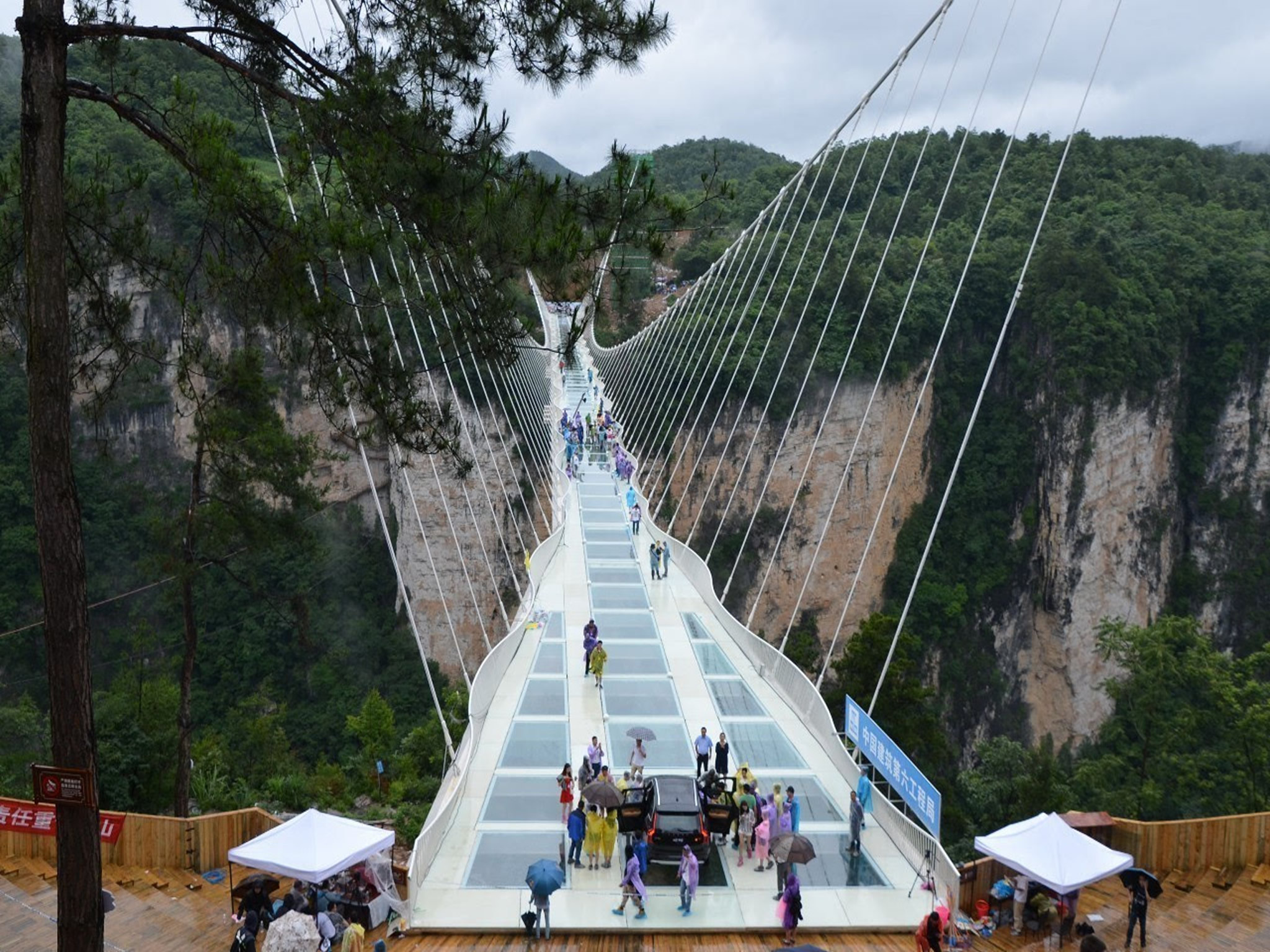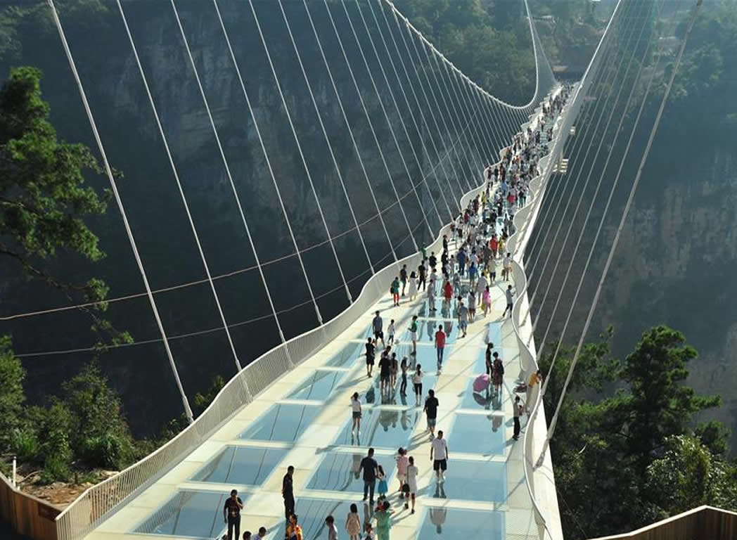 張家界大峽谷玻璃橋位于湖南省的張家界大峽谷景區(qū)栗樹埡和吳王坡區(qū)域內(nèi),為一座景觀橋梁,兼具景區(qū)行人通行、游覽、蹦極、溜索、T臺等功能。主跨430米,一跨過峽谷,橋面長375米,寬6米,橋面距谷底相對高度約300米。這座全透明玻璃橋長度、高度位居世界第一。